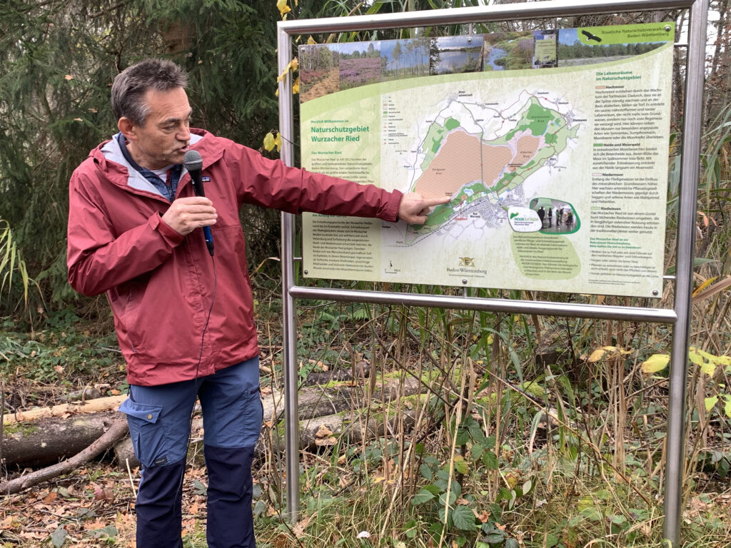Beim alten Torfwerk erläuterte Dr. Roth wie es zur Standortauswahl für den Turmbau gerade hier kam, um Besuchern unter minimalem Eingriff in das Naturschutzgebiet die Chance zu geben, das Ried in seiner Vielfalt an einmaligen Pflanzen und Tieren zu erleben. Auf dem bei der industriellen Nutzung damals befestigten Platz soll die Gründung des Turms erfolgen, nach wenigen Metern Torf erreicht man die vom Gletscher hergeschobene tragende Kiesschicht. Ausführlich erläuterte er das Gesamtkonzept des Vorhabens, um das Ried und die Geschichte des Torfabbaus an einer Stelle für den Besucher erlebbar zu machen; Roth sieht darin auch ein Stück Umweltbildung.