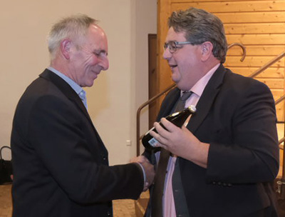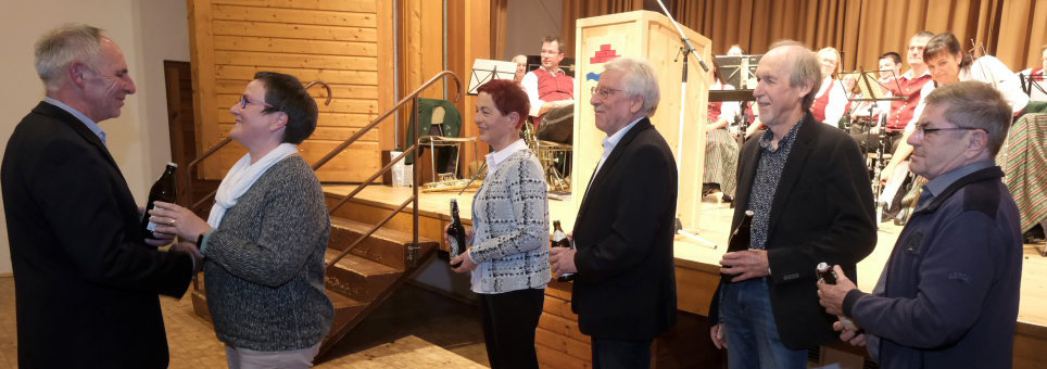 Nach zwei Liedern des Kirchenchors durfte Berthold Leupolz, der altersmäßig zwar jüngste, aber dennoch der dienstälteste aller Wurzacher Ortsvorsteher – er ist wie Reichle ebenfalls seit 25 Jahren im Amt – die Lobrede im Namen der Kollegen halten. In seiner Amtszeit habe Reichle drei Bürgermeister und viele Ortsvorsteher Kollegen kommen und gehen sehen. „25 Jahre hast Du neben der Familie deiner Ortschaft gewidmet. Wir haben viel bewegen können. Es war ein schönes Miteinander und es war – auch im Namen der Kollegen – schön, mit Dir zu arbeiten.“ Alfons Reichle sei nie ein Streithammel gewesen und habe immer ein offenes Ohr für jeden gehabt. Dafür sprach er ihm ein ehrliches „Vergelt´s Gott“ aus. Als Geschenk gab es für Reichle und seine Frau einen Gutschein für ein Essen im „Torfstecher“; bis dahin wurde er schon einmal von den Kollegen mit allen Biersorten aus der Region versorgt, mit der Auflage, am Ende den Kollegen „das Beste“ zu vermelden.