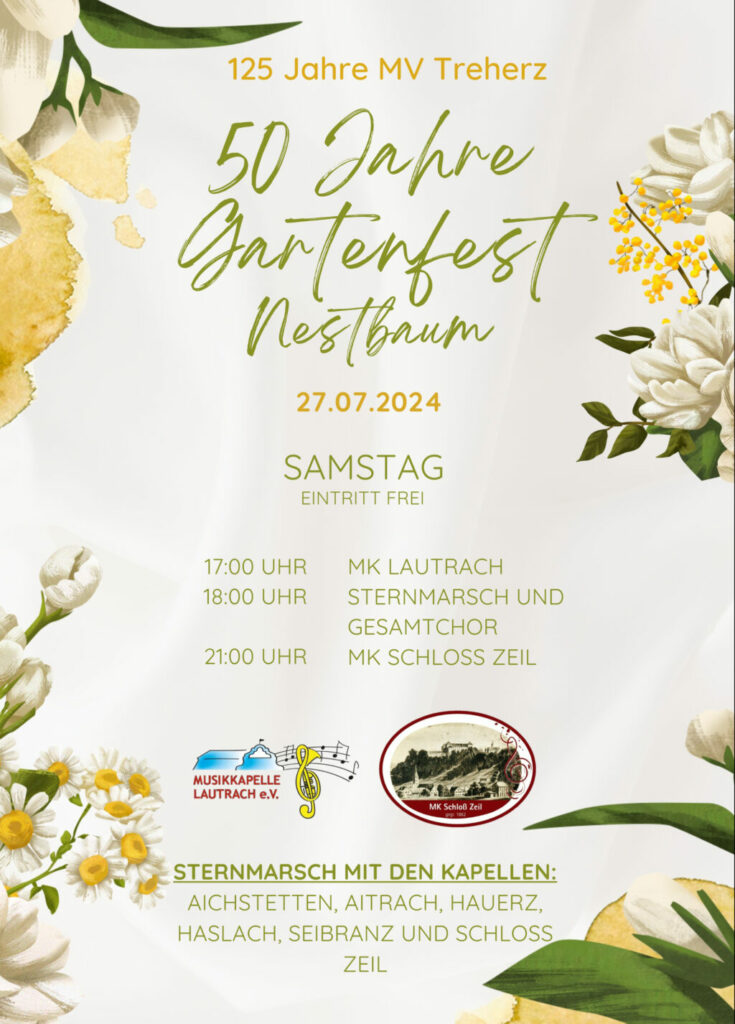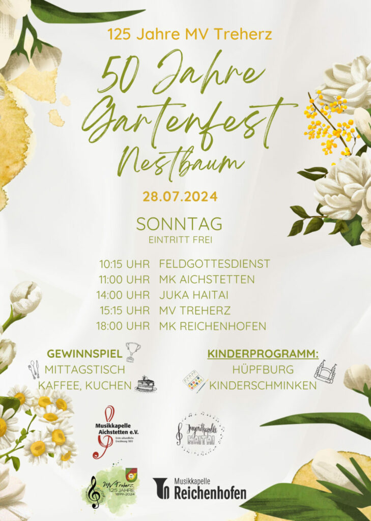 Nestbaum – An zwei Tagen wird Ende Juli in Nestbaum „50 Jahre Gartenfest“ gefeiert: am 27. und am 28. Juli. Einzelheiten hierzu auf dem nachstehend veröffentlichten Plakat. Ausweichtermin: 3. August / 4. August. Am Ausweichtermin findet das Fest auch bei schlechter Witterung statt: in der Reithalle Hauerz. Infos bei zweifelhafter Witterung: Facebook.com/mvtreherz, Instagram.com/mvtreherz, www.mv-treherz.de.