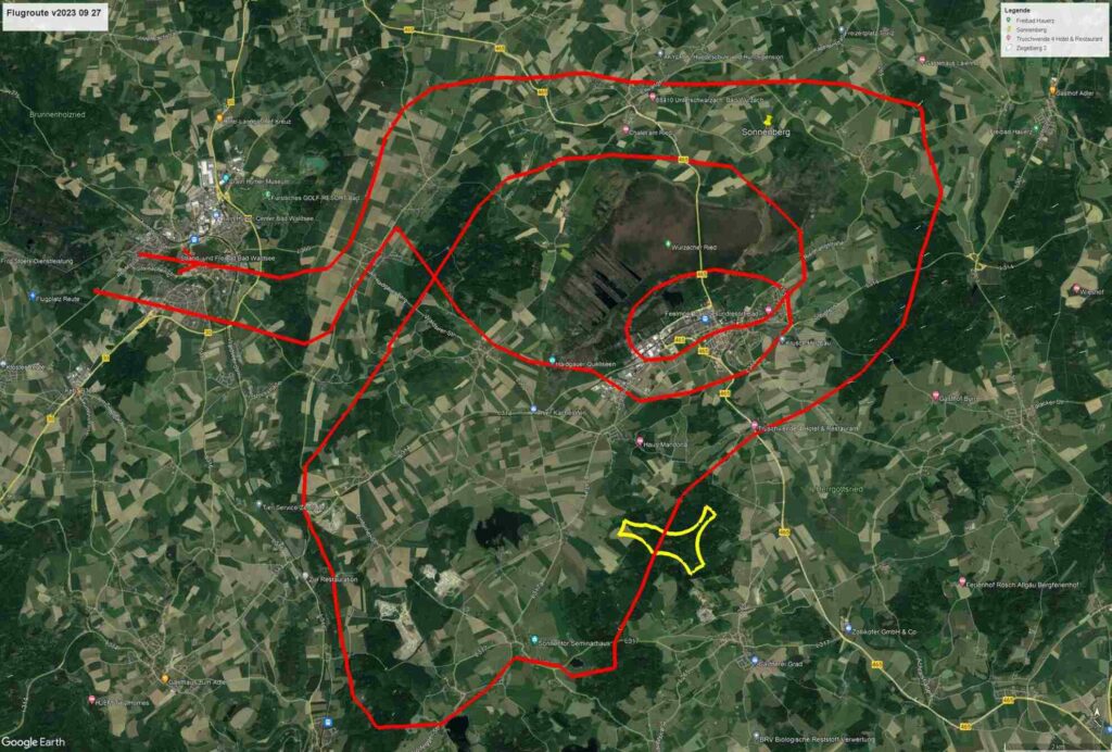 - Flug über die geplante Windkraftgebiete Hummelluckenwald, Alttanner Wald und mögliche Windkraftgebiete auf dem Beckenrand (eventuell Ziegelberg)