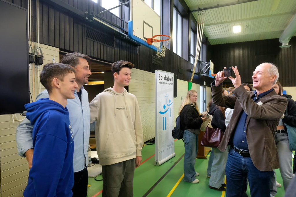 Nach seinem Vortrag gab es noch eine kleine Autogrammstunde sowie ein Fotoshooting, bei dem der Schulleiter gemeinsam mit Heiko Butscher stolz das mitgebrachte Gastgeschenk, ein lachsfarbenes Sonder-Trikot aus der aktuellen Kollektion des VfL , beschriftet mit der Nr. 5 und dem Namenszug Butscher, in die Kamera hielt.