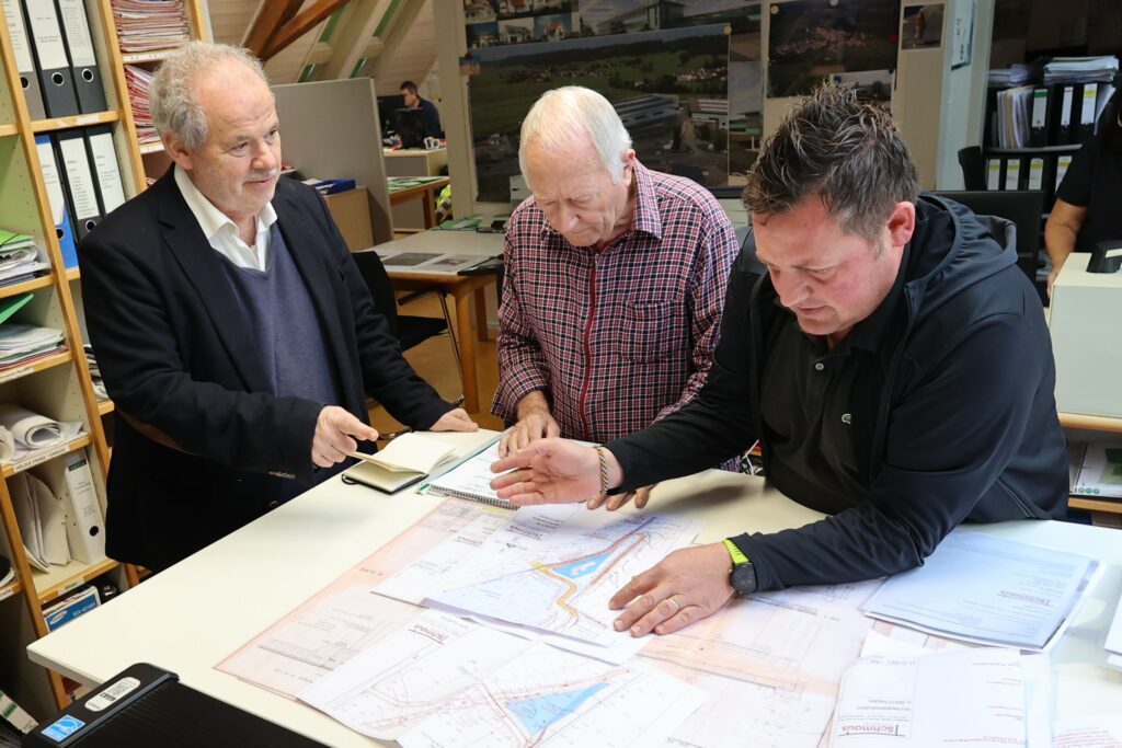 Hermann Schmaus (Mitte) und sein Mitarbeiter Thomas Welte (rechts) erläutern Bildschirmzeitungsreporter Julian Aicher ihren Vorschlag zum Bau eines Dammes südlich von Hauerz.