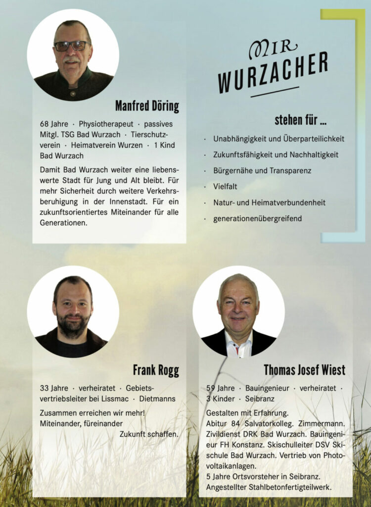 Bad Wurzach (dbsz) – Die Kandidierenden der Liste „Mir Wurzacher“ laden zu Bürgergesprächen ein. Nachstehend die Einladung und die vier Seiten aus dem Wahlprospekt: