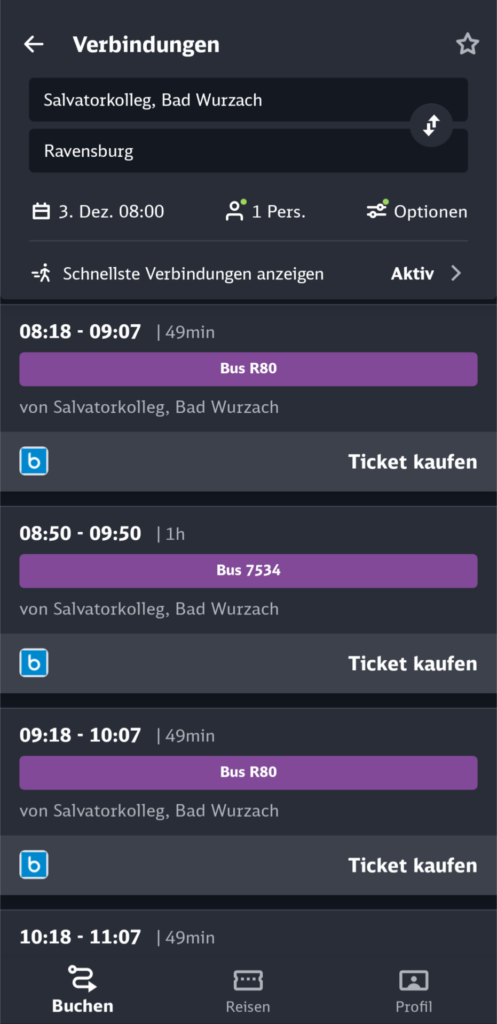 App DB Navigator: Innerhalb einer Stunde fahren drei Busse von Bad Wurzach nach Ravensburg. Eine Stunde später der nächste.