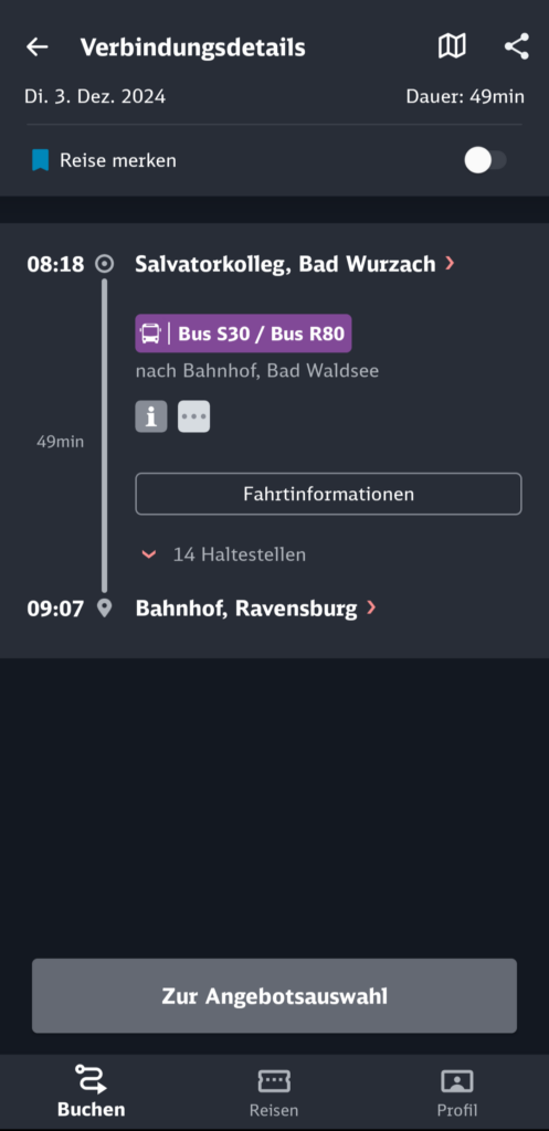 App DB Navigator: Die Busfahrt dauert 49 Minuten und umfasst insgesamt 14 Haltestellen.