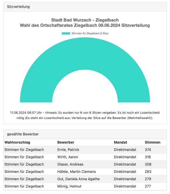 Ziegelbach (rei) – In Ziegelbach standen am Montagmorgen sechs der acht Ortschaftsräte fest; für das siebte und achte Mandat war ein Losentscheid notwendig, was aber bloß die Reihung betraf. Im Gemeindewahlausschuss am Dienstagabend ergab das Los, dass Thomas Maier (271 Stimmen) auf Platz sieben der Ergebnisliste und Kilian Hierlemann (ebenfalls 271 Stimmen) auf Platz achtt aufgeführt wird. Stimmenkönig ist Patrick Ernle; auf ihn entfielen 374 Wählervoten. Auf Platz zwei rangiert Aaron Wirth (316 Stimmen). Nachstehend das grafisch unvollständige Ergebnis der Ziegelbacher Ortschaftsratswahl, entnommen der Webseite der Stadt Bad Wurzach: