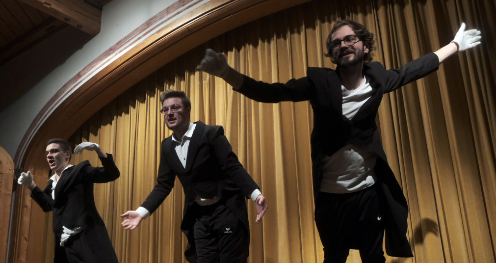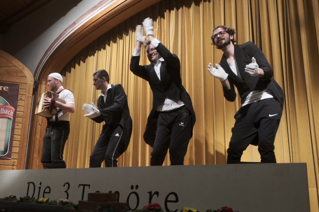 Nach einem kurzen musikalischen Zwischenspiel gab es zum Abschluss des Showprogramms noch einmal einen rasanten und artistischen Höhepunkt: In halsbrecherischen Verrenkungen sangen die drei Tenöre David Wirth, Patrick Ernle und Florian Herz (von links) die 60 Jahre alte Liebesschnulze „Aber Dich gibt´s nur einmal für mich“, bei der Zugabe im Disco-Stil gemeinsam mit DJ Ötzi (Leon Wirth).