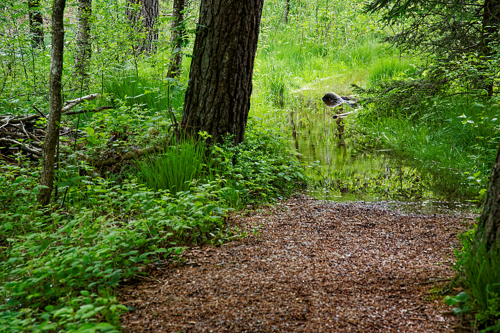a) einen – teilweise beschwerlichen – Naturpfad laufen, der oftmals unter Wasser steht.