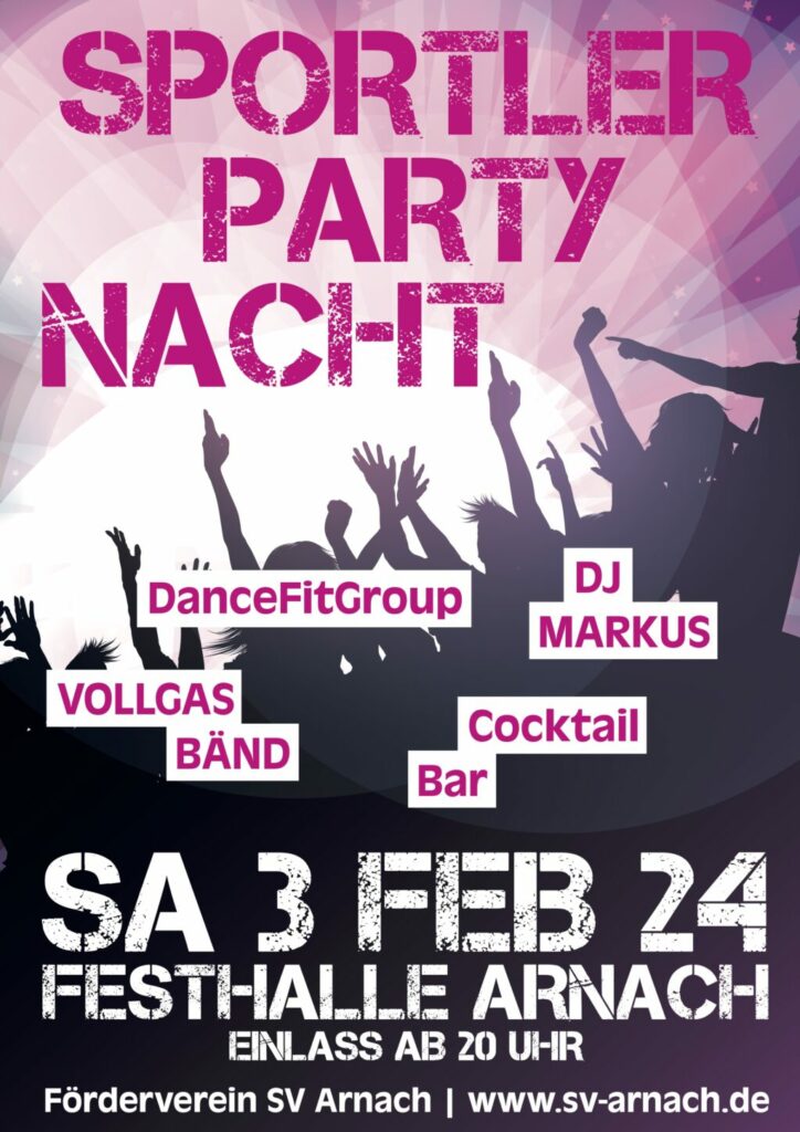 Arnach – Am heutigen Samstag, 3. Februar, ist der große Tag der Arnacher Sportlerfasnet: Um 14.00 Uhr ist in der Turn- und Festhalle der Kinderball. Und um 20.00 Uhr steigt die Party-Nacht – ebenfalls in der Turn- und Festhalle. Es spielt die „Vollgas-Bänd“. Eingeladen sind Party- und Fasnetsfans aus nah und fern. Nachstehende die Plakate zu den beiden Veranstaltungen: