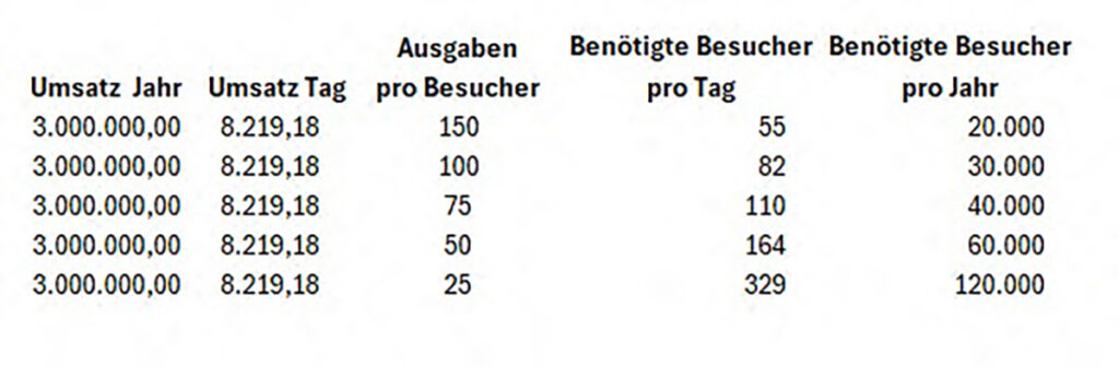 Da ich Zahlen gerne hinterfrage, habe ich mir auch Gedanken gemacht, was die kolportierten 3 Millionen Euro Zusatz-Umsatz bedeuten, den die Besucher ins „Städtle“ tragen sollen. Die Daten habe ich in der nachfolgenden Tabelle veranschaulicht. Fazit: Der Umsatz ist ein Wunschdenken und nicht real.