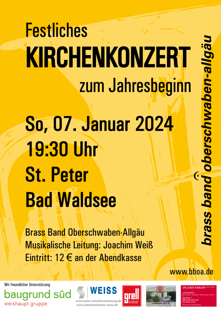 Erleben sie die Brassband Oberschwaben-Allgäu unter der Leitung des Dirigenten Joachim Weiß. Ein unbeschreibliches Klangerlebnis, das man sich nicht entgehen lassen sollte! Konzertbeginn ist um 19.30 Uhr, Eintrittskarten gibt es an der Abendkasse.