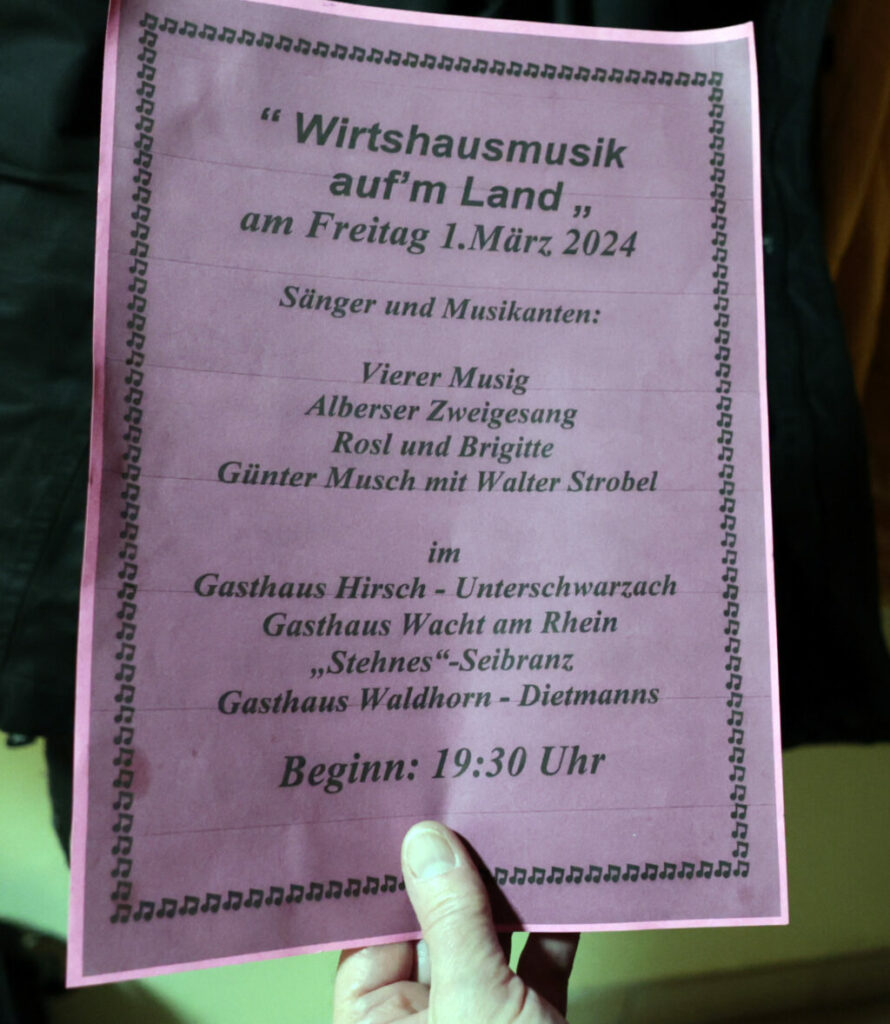 Angefangen hatte das Musizieren in jeder der drei Wirtschaften um 19.30 Uhr. Unser Reporter Hans Reichert berichtet in Wort und Bild vom Wirtshaus-Musizieren in der „Wacht am Rhein“. Dasselbe Programm wurde – zeitlich versetzt – in den beiden anderen Wirtschaften aufgeführt; dort hat Uli Gresser für die Bildschirmzeitung fotografiert und Notizen gemacht.