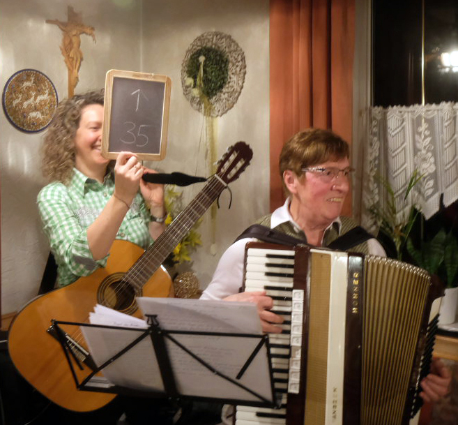 Vom Landleben können Gregor Holzmann und Frank Seitz witzige Geschichten zum besten geben. Darin ist vom Häge und seinen Kühen die Rede, vom Fritzle in der Schule und von der Stallmagd mit dem Bauern, dem Knecht und der Bäuerin. Sogar vom Papst und dass der den Wolfgang Grösser kennt und diesen auf dem Balkon namentlich begrüßt. Aus dem Volk von Rom ertönt beim Anblick der beiden auf dem Balkon die Frage: „Wer isch au des nebem Wolfgang?“ „So bringt ma d‘ Leut‘ zum Lacha“, sagt Gregor. Solche Einlagen gehören beim Wirtshaus-Musizieren einfach dazu.