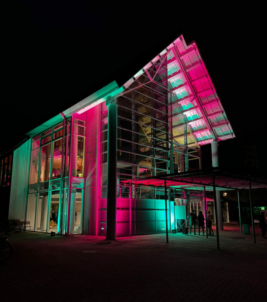Freitag, 25. Oktober, 19.30 Uhr. Vom Parkplatz kommend, erblicken wir ein illuminiertes Kurhaus. Rot- und Grüntöne dominieren. Am Eingang treffen wir Petra Springer. Ein bisschen angespannt sei sie schon, bekennt der Veranstaltungsprofi, den so schnell nichts aus der Fassung bringen kann. Es steht ja heute etwas Besonderes, etwas für Bad Wurzach besonders Wichtiges an: das Eröffnungsfest für das „neue“ Kurhaus. Aus dem darniederliegenden Haus hat eine Träger-Genossenschaft eine „Kulturschmiede“ mit zugehörigem Restaurant „Torfstecher“ gemacht. Diese Revitalisierung des für die Kurstadt Bad Wurzach zentralen Hauses soll heute gefeiert werden.