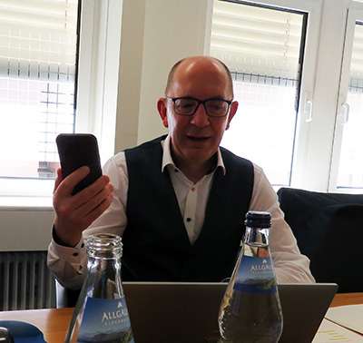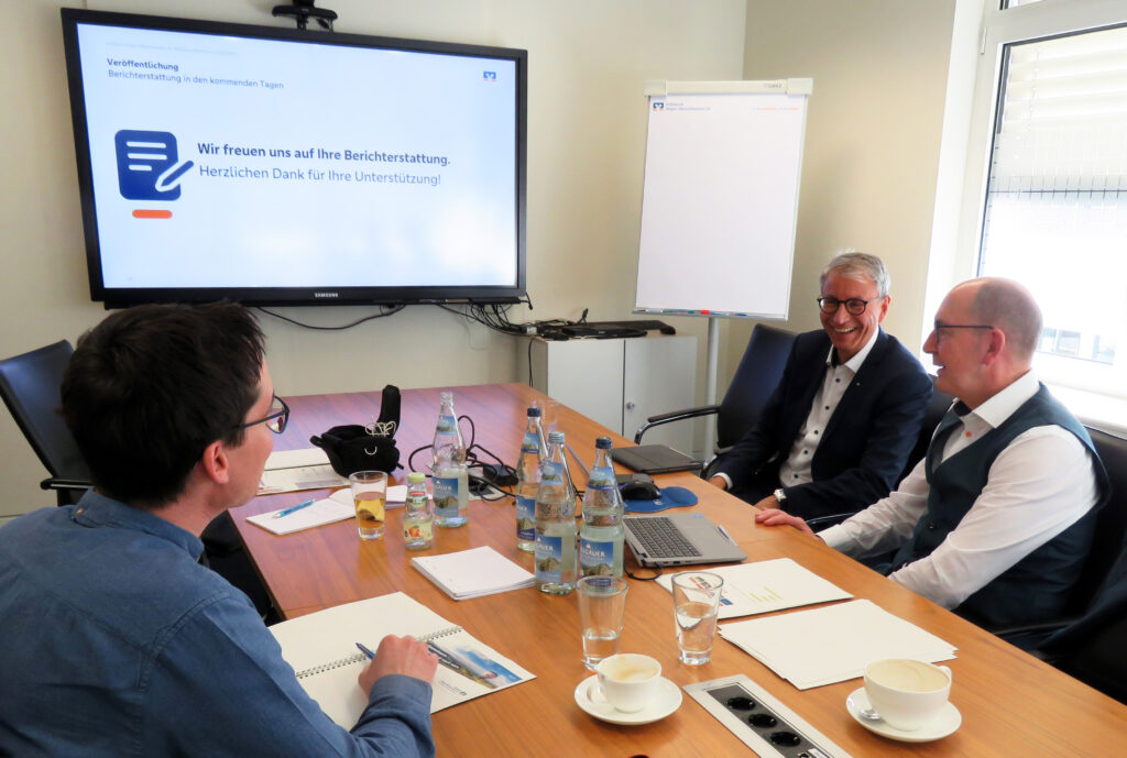 Die Ausführungen von Josef Hodrus beim Mitgliederforum in Leutkirch am 10. April knüpften an seine Darlegungen bei der Bilanzpressekonferenz (Bild) einige Tage zuvor an. „Wir freuen uns auf das gemeinsame Haus mit unseren Nachbarn“ – das war der Tenor des Gespräches mit der örtlichen Presse; Hodrus und sein Vorstandskollege Werner Mayer erläuterten voller Optimismus die Synergien des Zusammengehens mit der Volksbank-Raiffeisenbank Laupheim-Illertal eG. Wenn die jeweiligen Vertreterversammlungen zustimmen (am 3. Juli die Laupheim-Illertäler, am 4. Juli die Allgäu-Oberschwaben), dann wird das Zusammengehen rückwirkend zum 1. Januar 2024 vollzogen (unter dem Namen Volksbank Allgäu-Oberschwaben eG). In diesem Zusammenhang bekräftigte der Vorstandsprecher: „Wir erhalten die dezentralen Strukturen.“ Foto: Gerhard Reischmann