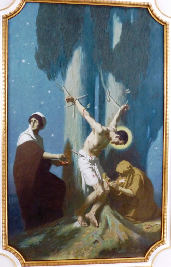 Das zweite Deckengemälde, das im durch ein geschmiedetes Chorgitter vom Schiff getrennt ist, findet meistens weniger Beachtung. Bei näherer Betrachtung kann allerdings festgestellt werden, dass das Gesicht des auf dem Chorgemälde abgebildeten Sebastian in der Rüstung eines römischen Soldaten sehr dem des am Baum mit Pfeilen gemarterten Sebastian im Schiff gleicht.