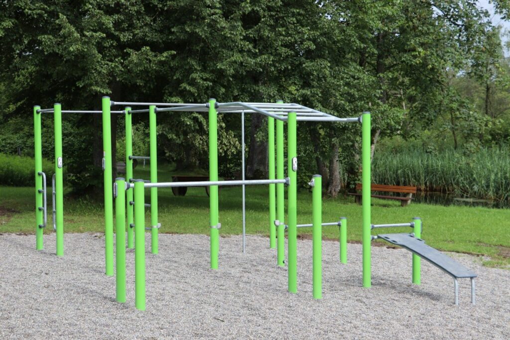 Besonders farbenfroh in limette-grün angelehnt an die Farbgebung aus dem städtischen C.I. präsentiert sich auch die neue Calisthenics-Anlage Richtung Minigolfplatz. „Auf diesem Fitnessparcours mit Stangen in verschiedenen Größen, Formen, Positionen und Höhen können Erwachsene und Jugendliche ebenfalls ab einer Körpergröße von 1,40 m unterschiedlichste Übungen durchführen.“