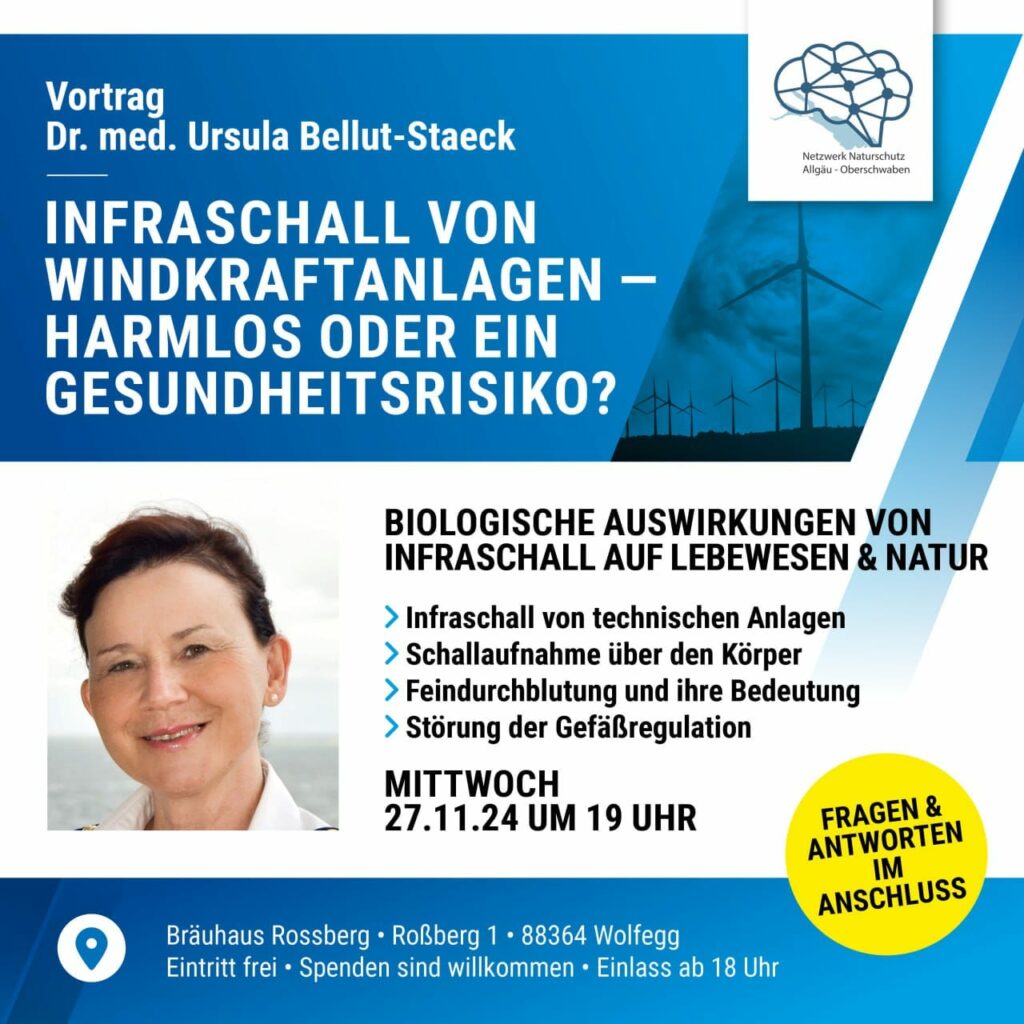 Roßberg – Am 27. November spricht Dr. med. Ursula Bellut-Staeck im „Bräuhaus“ zum Thema „Infraschall von Windkraftanlagen – harmlos oder ein Gesundheitsrisiko?“ Beginn ist um 19.00 Uhr (Einlass ab 18.00 Uhr). Eine Veranstaltung des Netzwerkes Naturschutz Allgäu-Oberschwaben.