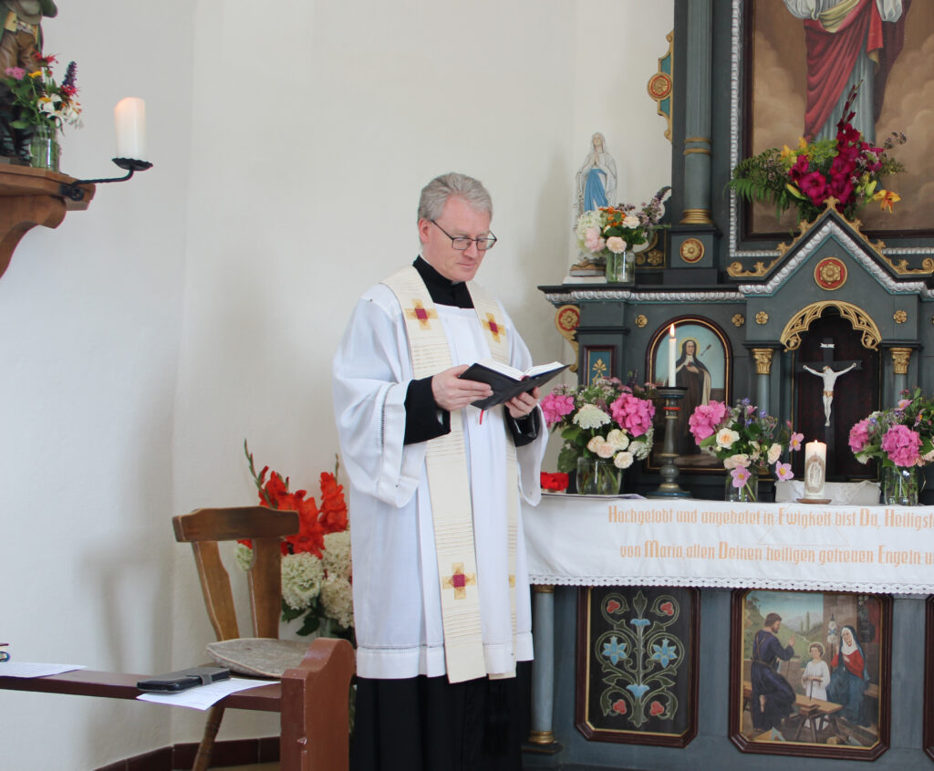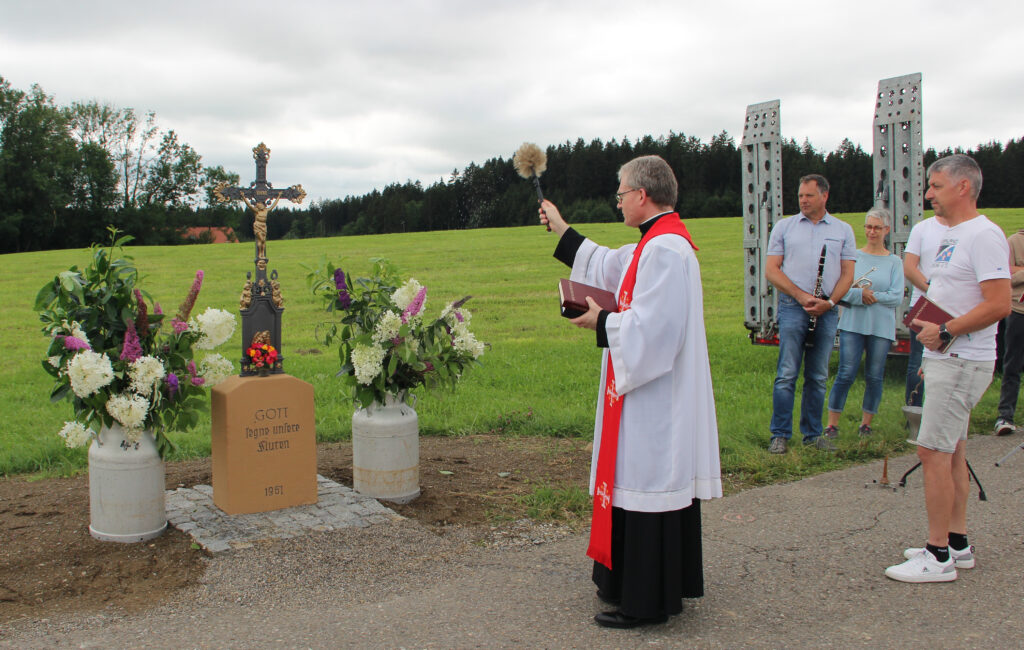Zu Beginn der Feier segnete Pfarrer Patrick Meschenmoser (Bild) das renovierte Feldkreuz der Familie Nunnenmacher am Ortseingang. Edwin Kesenheimer hatte das alte Feldkreuz in den letzten Monaten liebevoll restauriert.