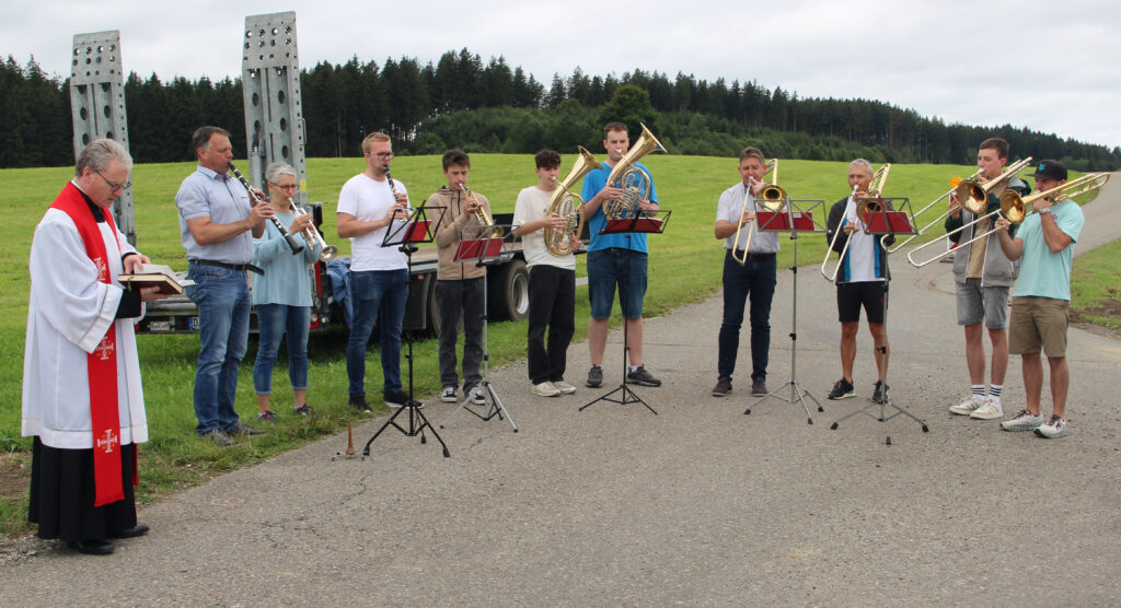 Nach der Kreuzsegnung ging es in die Kapelle, wo eine kurze Herz-Jesu-Andacht stattfand. Zehn „Humberg-Bläser“ (Bild) umrahmten die Segnung am Kreuz sowie die Andacht musikalisch.