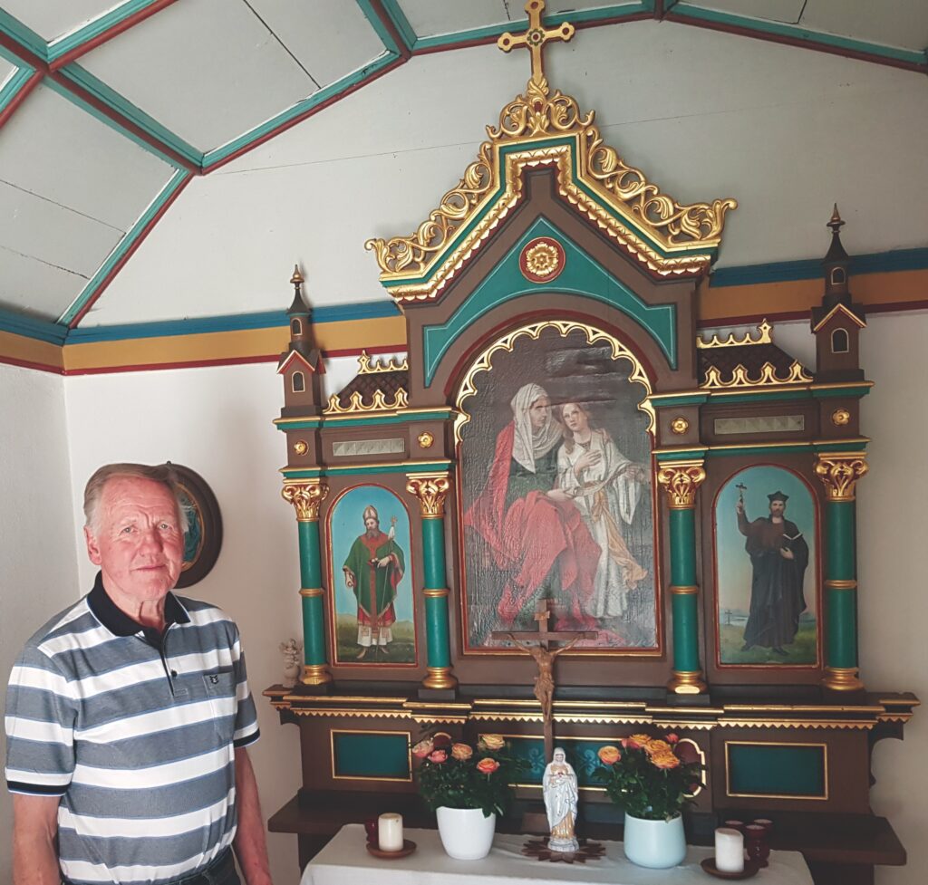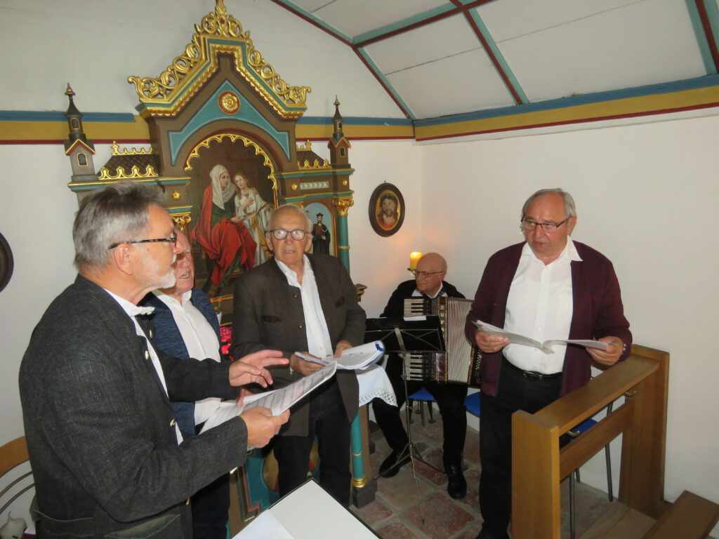 Dem Quintett, bestehend aus Hermann Schick, Hansjörg Schick, Manfred Miller, Simon Ringer und Vitus Ehrmann, oblag die Gestaltung des Schlussteils der Zusammenkunft in dem makellosen, weil frisch renovierten sakralen Raum. Es erklangen, bauend auf gekonntes Akkordeonspiel, die Lieder „Abendfrieden“, „Alpenfrieden“ und „Die güldene Sonne“. Auf Wunsch aus der Zuhörerschaft beschloss man den Abend mit „Guten Abend, gut‘ Nacht“ von Brahms und der deutschen Version von „Amazing grace“, also dem Lied „Ein schöner Tag“. Vierzehn Menschen genossen den Moment.