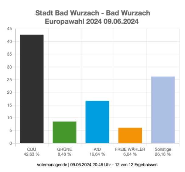 Bad Wurzach (rei) – Bei der Europawahl im Bereich Bad Wurzach erreichte die CDU mit 42,6 % das klar stärkste Ergebnis. Auf Platz 2 im Bereich der Gesamtgemeinde liegt die AfD mit 16,6 %. Die Grünen erreichen im Bereich der Großgemeinde Bad Wurzach 8,5 %, die Freien Wähler 6,0 %. Die Kanzlerpartei SPD wird in dem Säulendiagramm, das auf der Webseite der Stadt um 20.46 Uhr aufscheint, unter Sonstige gebucht. Für die Sozialdemokraten votierten 409 Wähler – von 7255. Wahlberechtigt waren 10.919 Personen; die Wahlbeteiligung betrug 66,44 %. Das beste Ergebnis erreichte die CDU mit 56,2 Prozent in Hauerz, dem „Stammland“ der örtlichen CDU-Vorsitzenden. Der zweite Wahlsieger, die AfD, holte in Eintürnen fast 24 Prozent. Das könnte auch mit der besonderen Situation der Ortschaft bei der Windkraftplanung zusammenhängen, gegen die sich in dem von zwei Seiten betroffenen Ort zunehmend Widerstand regt. Gegen diese Vermutung spricht das Arnacher Ergebnis: Dort schnitt die AfD mit 16,2 Prozent am schlechtesten ab, gefolgt von Bad Wurzach Ost (16,3 Prozent). Arnach könnte mit drei Windkraftanlagen im Hummelluckenwald ebenfalls WKA-betroffen sein. Auffällig: AfD-Wähler tendieren zur Präsenzwahl: Bei den Briefwahlergebnissen konnte diese Partei lediglich einen Anteil von 9,8 Prozent verbuchen.