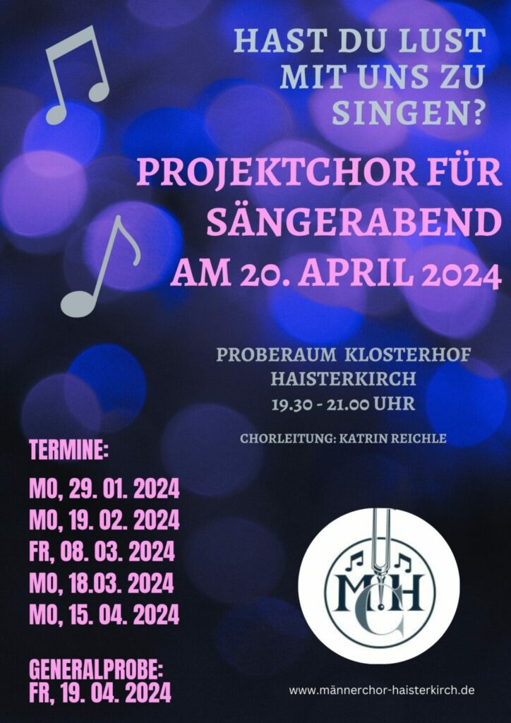 Es sind keine Vorkenntnisse erforderlich und kein Vorsingen notwendig. Voraussetzung ist allein die Freude am Singen in Gemeinschaft. Der Projektchor bietet die Möglichkeit, für einen begrenzten Zeitraum mit dem Chor gemeinsam zu proben und beim Konzert im April mit aufzutreten. Für den Sängerabend werden in den fünf Proben unter der Leitung von Katrin Reichle zwei neue Stücke einstudiert.
