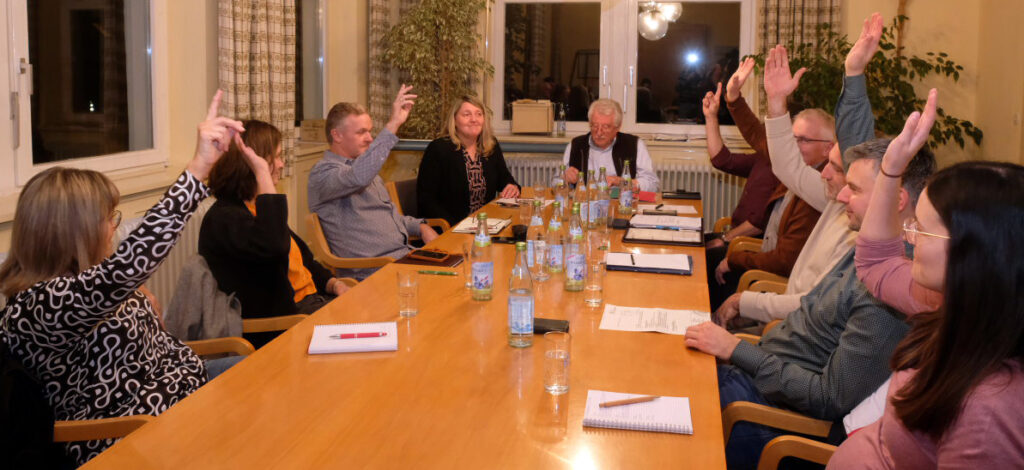 Die Wahl von Manfred Braun erfolgte offen. Alle acht Ortschaftsräte votierten für Braun. Ortsvorsteher Michael Rauneker (an der Stirnseite des Tisches) ist in der laufenden Amtsperiode des Ortschaftsrates kein stimmberechtigtes Mitglied und konnte mithin die Hand zur Zustimmung nicht heben. Foto: Uli Gresser