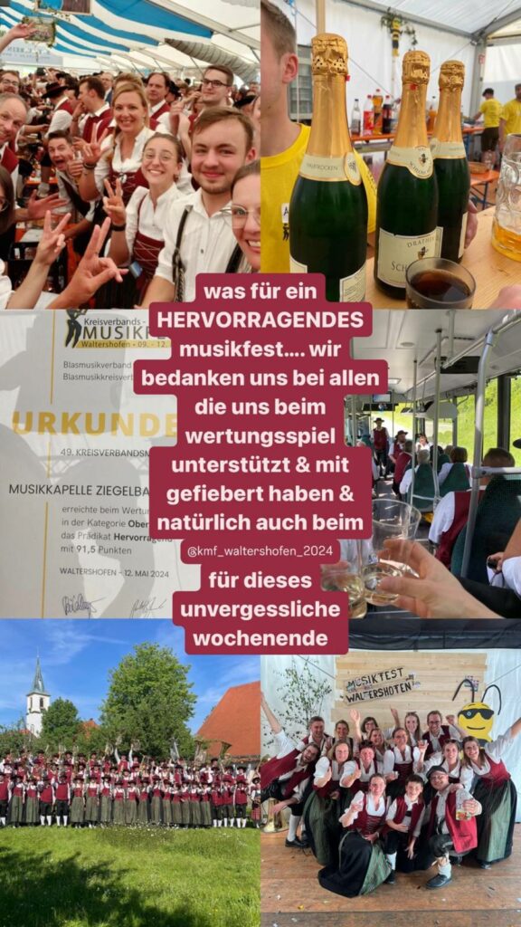 Unter der Leitung von Oliver Herz wurde in der Oberstufe zuerst das Selbstwahlstück „In All Its Glory“ von James Swearingen und anschließend das Pflichtstück „The Legend of Maracaibo“ von Jose A. Pina in der Kißlegger Sporthalle aufgeführt. Von den vom Landesblasmusikverbandes Bad Württemberg gestellten Juroren wurden 91,5 Punkte für den Vortrag vergeben. Bei der Bekanntgabe des Ergebnisses mit dem Prädikat „Mit hervorragendem Erfolg“ am Sonntag, 12. Mai, um 17.30 Uhr war die Freude unbeschreiblich groß. Ein besonderer Dank gilt allen, die zu diesem herausragenden Erfolg beigetragen haben, den Musikerinnen und Musikern, dem Dirigenten Oliver Herz für die punktgenaue Vorbereitung und vor allem den Zuhörern und Unterstützern der Musikkapelle Ziegelbach.
