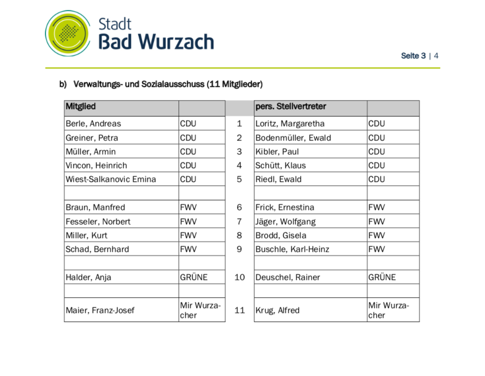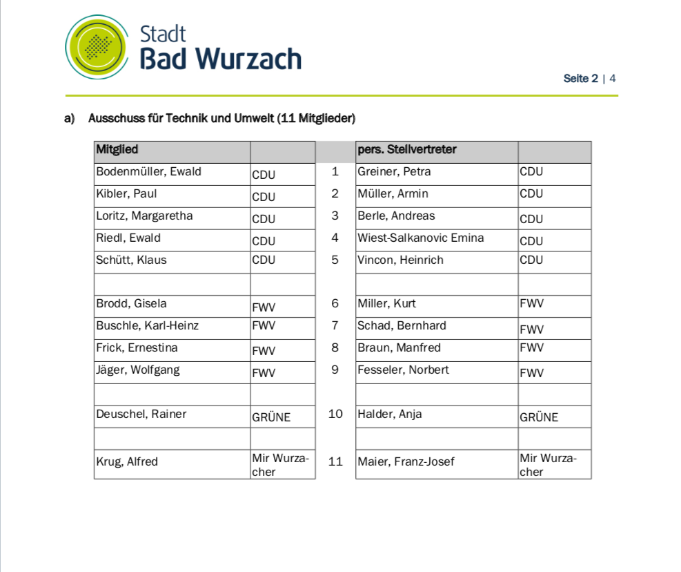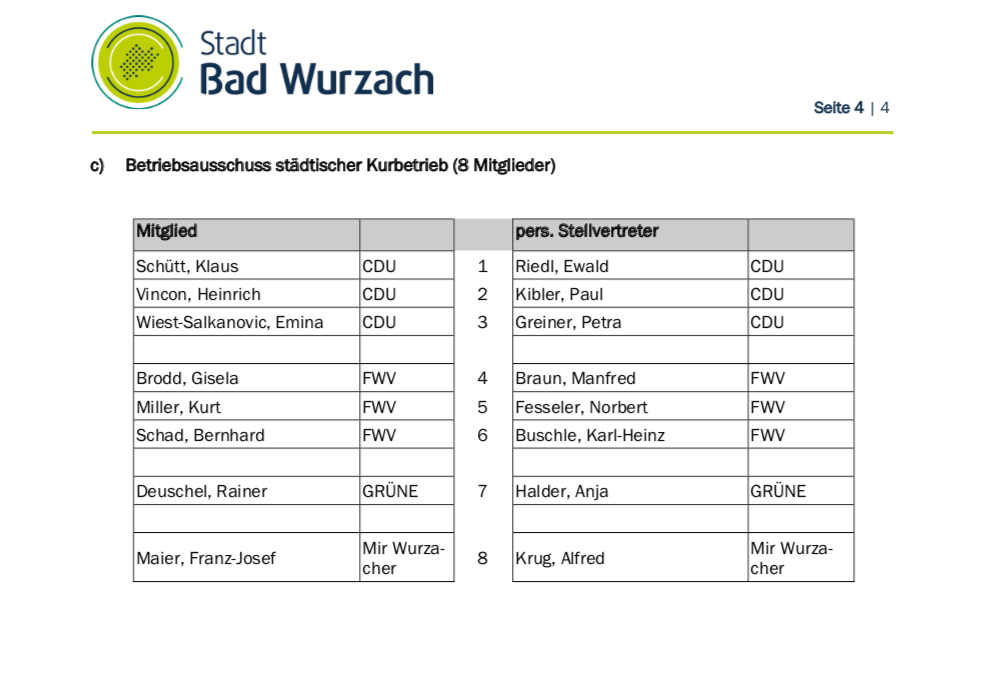Bad Wurzach – Nach den Änderungen der Geschäftsordnung des Gemeinderates und der Hauptsatzung der Stadt Bad Wurzach konnten die drei beschließenden Ausschüsse Ausschuss für Technik und Umwelt (ATU), der Verwaltungs- und Sozialausschuss (VSA) sowie der Kurbetriebsausschuss (KBA) durch die Mitglieder des neugewählten Gemeinderates besetzt werden.