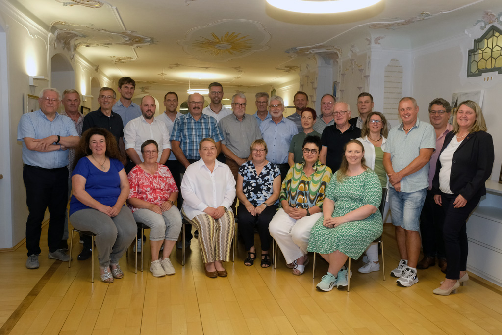 Der neue Bad Wurzacher Gemeinderat mit allen Ortsvorstehern (vier sind als Stadträte stimmberechtigte Mitglieder, fünf sind beratende Mitglieder). Der Gemeinderat hat 22 stimmberechtigte Mitglieder; weiter ist auch die Bürgermeisterin stimmberechtigt. Es fehlt auf dem Bild Stadtrat Ewald Bodenmüller. Die Namen der Stadträte (einschließlich der stimmberechtigten Ortsvorsteher) sind unter dem Bild am Anfang des Artikels genannt. Auf diesem Bild haben sich vier der fünf Ortsvorsteher, die als beratende Mitglieder im Gemeinderat vertreten sind, hinzugesellt. Es sind dies Michael Rauneker (Arnach; stehend, ganz links), Sybille Schleweck (Ziegelbach; stehend, Achte von rechts), Berthold Leupolz (Eintürnen; stehend, Zweiter von rechts) und Monika Ritscher (Dietmanns; fehlend). Die beiden bei der konstituierenden Sitzung am 29. Juli fehlenden Ratsmitglieder waren entschuldigt. Foto: Uli Gresser