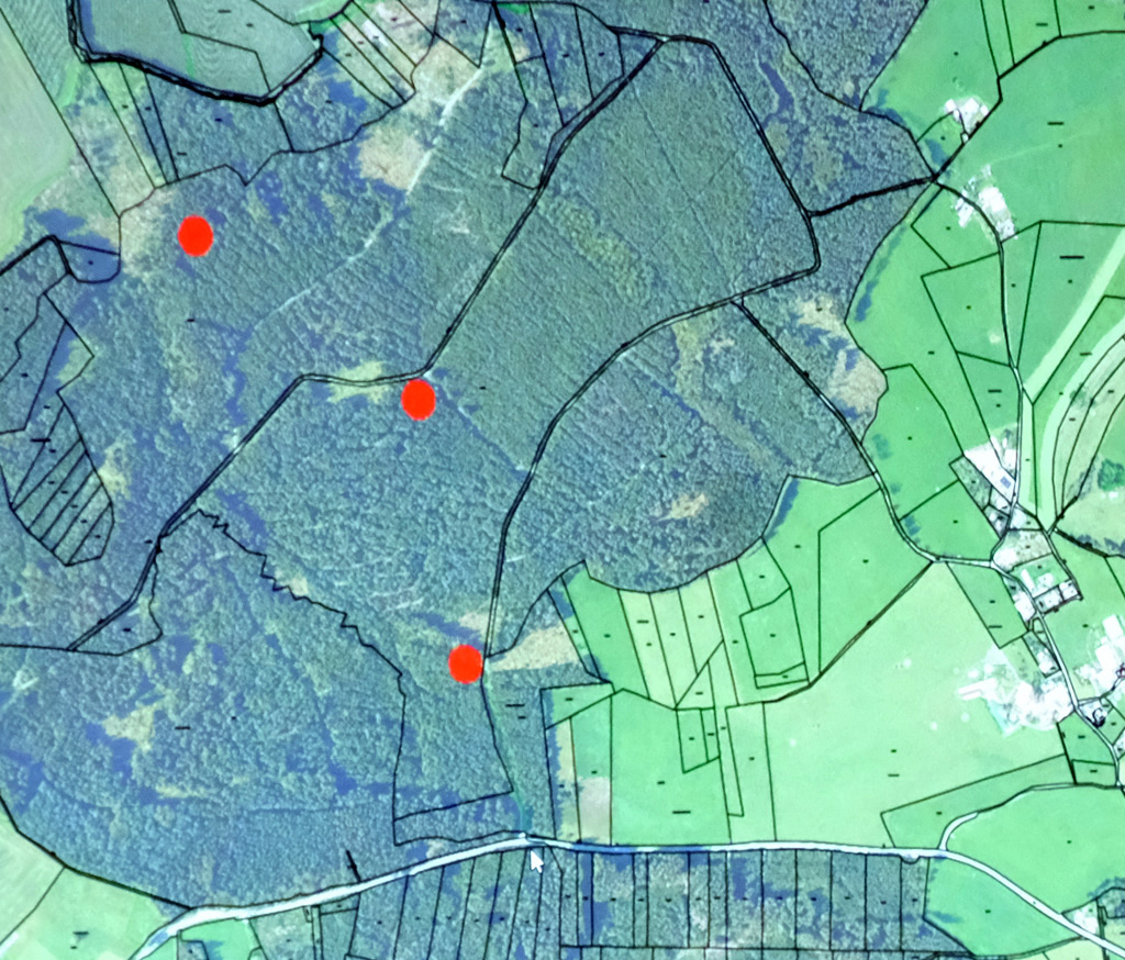 Die drei Standorte der im Hummelluckenwald geplanten Windkraftanlagen; rechts der Weiler Humberg.