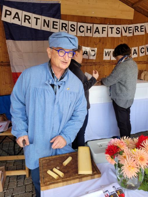 Unterstützt vom Luxeuil-Komitee haben der ehemalige Bürgermeister Michel Raison und seine Frau Yvette frische Baguette mit Wein, Käse und Schinken aus ihrer Heimat, der Franche Comté, zum Verkosten und zum Verkauf angeboten.