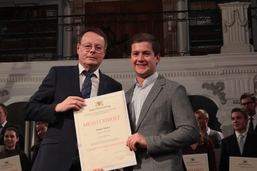 Ochsenhausen – Im Prachtbau des Klosters Ochsenhausen war Freude überall – in den Deckengemälden und in den Gesichtern der 38 neuen Meister und Meisterinnen der Landwirtschaft. Ein würdevoller Rahmen für die feierliche Übergabe der Urkunden durch Regierungspräsident Klaus Tappeser. Die Bläser von „HeiliXblechle“ spielten sogar eine Intrada von Nikolaus Betscher, dem letzten Abt des Klosters vor der Mediatisierung.