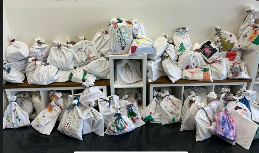 Einige der 1610 Stofftaschen, gefüllt mit Liebesgaben.