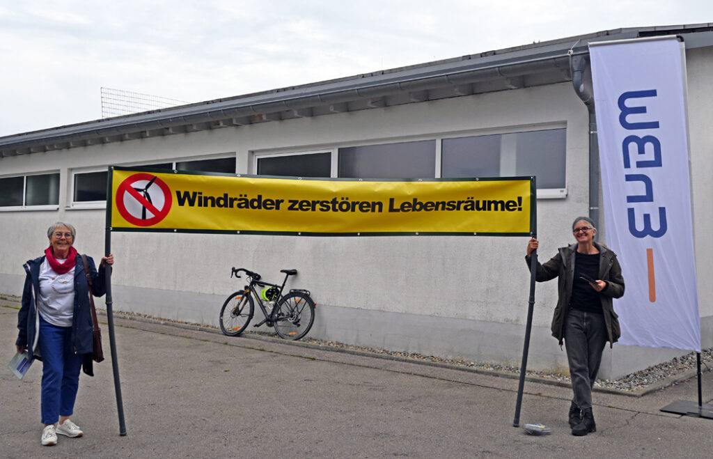 Draußen vor der Tür standen zwei Windkraftgegnerinnen von 19.00 Uhr bis nach 21.00 Uhr mit einem Spannband; sie berichteten von interessanten Gesprächen.