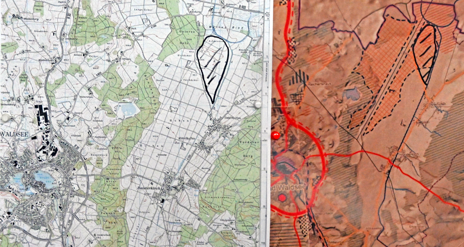 Diese sieben – vorläufigen – WKA-Standorte bei Osterhofen / Hittelkofen nannte die EnBW bei ihrer Informationsveranstaltung am 11. Juni in Haisterkirch. Der südliche Bereich der vom Regionalverband als WKA-Planfeld (Entwurf) ausgewiesenen Zone (gelb schraffiert) wird von Projektierer Franz Biesinger und seiner Osterhofer Wind GmbH GmbH beplant. Rechnet man die Dislozierung der EnbW hoch, würde es im Südteil der Planfläche vier bis fünf WKA geben – in der Summe im Haistergau also bis zu zwölf.