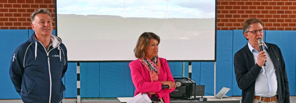 Michael Soukup, Leiter der Projektentwicklung Wind bei der EnBW, und Andreas Heizmann, der für das aktuelle Projekt Verantwortliche, luden die Bürgerinnen und Bürger ein, sich an den Infoständen alle gewünschten Auskünfte zu holen.