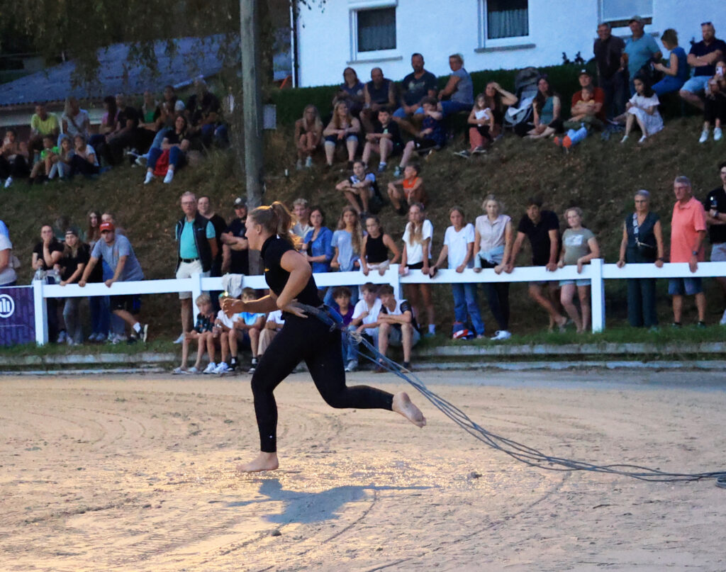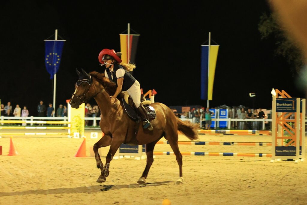 Hauerz – Nicht nur Pferde haben die Hufe geschwungen am Showabend in Hauerz auf dem Reitgelände. Zweibeiner sind genauso gefordert werden. Es galt nämlich zu hüpfen, gegen ein Bungee-Seil anzurennen und Tennisbälle sammeln und, man beachte, unter einer Hindernisstange durchzuspringen. Darunter war der Wassergraben, der sonst eine Erschwernis für Springpferde ist. Nachstehend Eindrücke unseres Reporters Hans Reichert, der viele Bilder „geschossen“ hat (siehe Galerie). Ergebnisse vom Samstagabend finden Sie am Ende des Artikels.