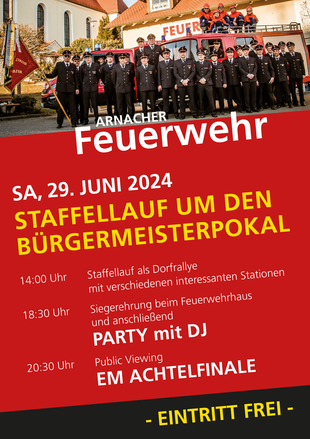 Das Organisationsteam hat sich für den Wettbewerb um den Bürgermeisterpokal einiges einfallen lassen und eine Rallye durchs Dorf mit zahlreichen interessanten und originellen Spielen und Stationen ausgedacht. Für alle interessierten Feuerwehrler und Nichtfeuerwehrler besteht die Möglichkeit, ab ca. 14.30 Uhr am Feuerwehrhaus, bei der Schule und am Sportgelände die unterschiedlichen Teams anzufeuern und zu unterstützen. Die Kameraden der Arnacher Wehr, die leider selbst nicht teilnehmen dürfen, würden sich über regen Besuch freuen und bewirten alle am Feuerwehrhaus mit Gegrilltem und Getränken. Die anschließende Siegerehrung findet ab ca. 19.00 Uhr an der Fahrzeughalle mit Zelt statt.