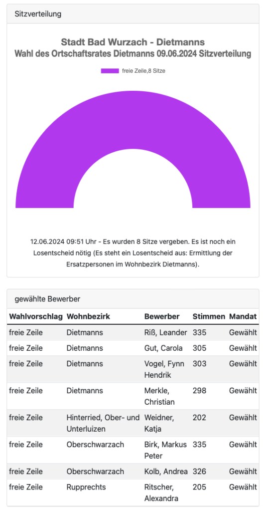 Dietmanns (rei) – In der Ortschaft (Teilgemeinde) Dietmanns sind bei der Ortschaftsratswahl von den 726 Wahlberechtigten 497 zur Wahl gegangen. Das ist eine Wahlbeteiligung von 68,5 Prozent. In Dietmanns wird auf Ortschaftsebene eine Unechte Teilortswahl durchgeführt. Am Mittwoch um 9.51 Uhr wurde das Ergebnis auf der Webseite der Stadt veröffentlicht.