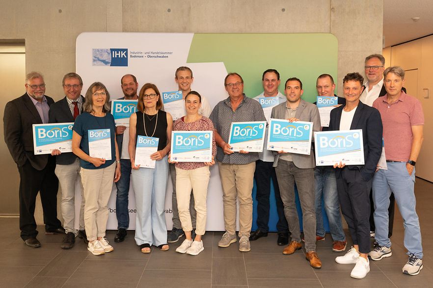 Die Vertreter von Achtalschule Baienfurt, Leopoldschule Altshausen Gemeinschaftsschule Bergatreute, Herzog-Phillip Verbandsschule Altshausen, Realschule Bad Waldsee und der Werkrealschule Bad Wurzach mit den Juroren für das BoriS-Berufswahl-SIEGEL Baden-Württemberg und Vertretern der IHK Bodensee-Oberschwaben. Foto: WRS