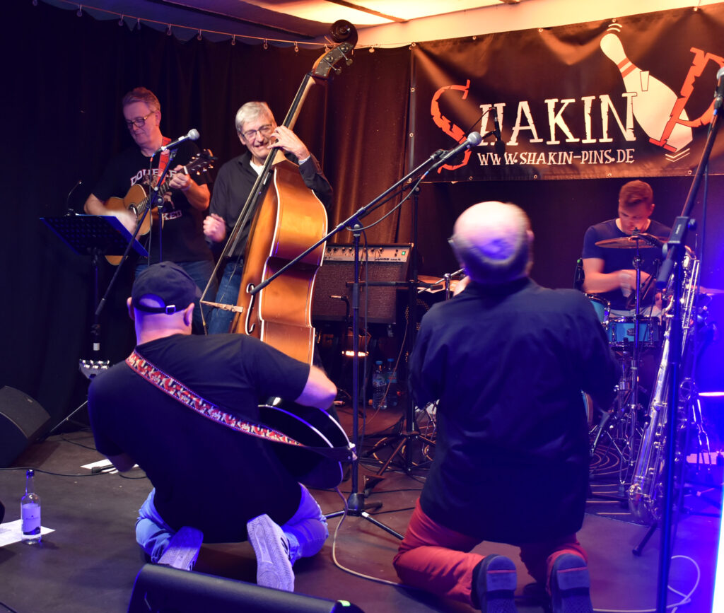 Drinnen drehte sich das Tanzbein derweil weiter. Die „Shaking‘ Pins“ brachten mit ihrem waschechten Rock’n’Roll nicht allein die Malztennen-Bühne zum Beben, sondern bewegten sich mit ihrem Sänger direkt ins Publikum. Das sorgte für heiße Stimmung – ergänzt durch allerhand kühle Getränke – direkt im gleichen Raum geboten.