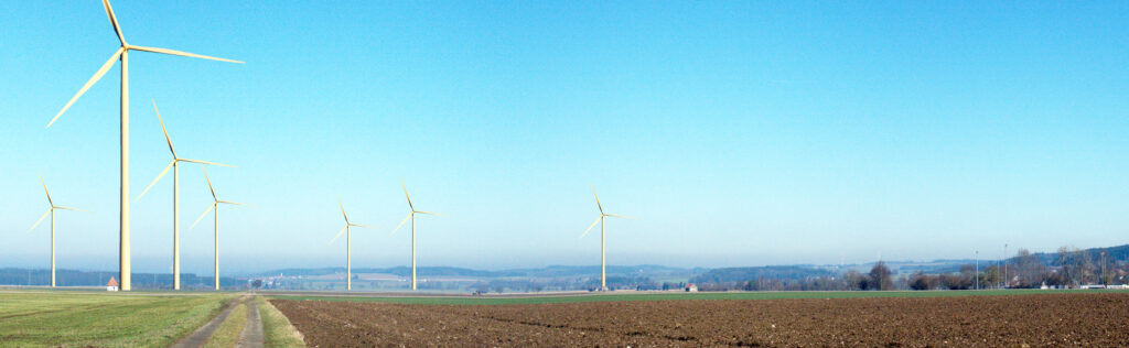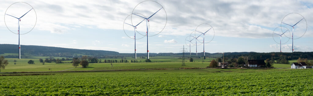 Derzeit sind bei Osterhofen acht Windkraftanlagen modernster Bauart geplant. So sähe der Blick von Mühlhausen auf die etwa 270 Meter hohen Anlagen aus. Visualisierung: Reinhold Mall