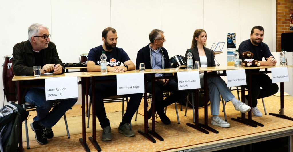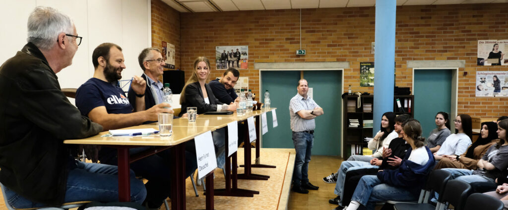 Das Podium sowie Lehrer Tobias Ernst (stehend) und Schüler.