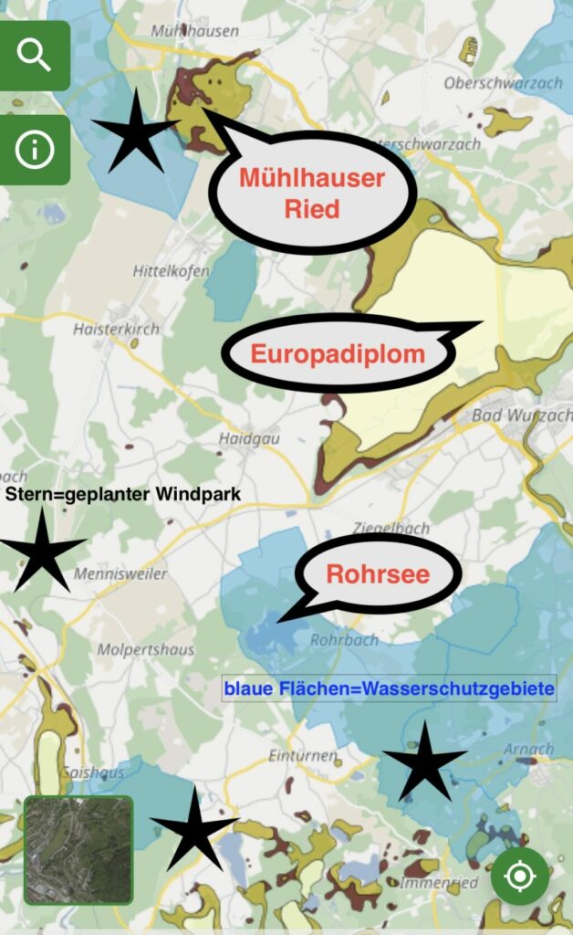 Diese Karte wurde bei der Windkraftveranstaltung in Haidgau gezeigt. Sie zeigt die Naturschutzgebiete Mühlhauser Ried, Wurzacher Ried und Rohrsee. Die schwarzen Sterne markieren die vom Regionalverband Bodensee-Oberscgwaben vorgesehenen Windkraftstandorte Osterhofen, Mittelurbach-Mennisweiler und Alttann-Weitprechts sowie den von Laoco/Energiequelle angestrebten Standort Humberg. Möglichweise weist der Regionalverband Donau-Iller zusätzlich noch bei Mühlhausen ein weiteres Windkraftgebiet aus. Die Basis-Karte stammt aus der Umwelt-App des Landes Baden-Württemberg.
