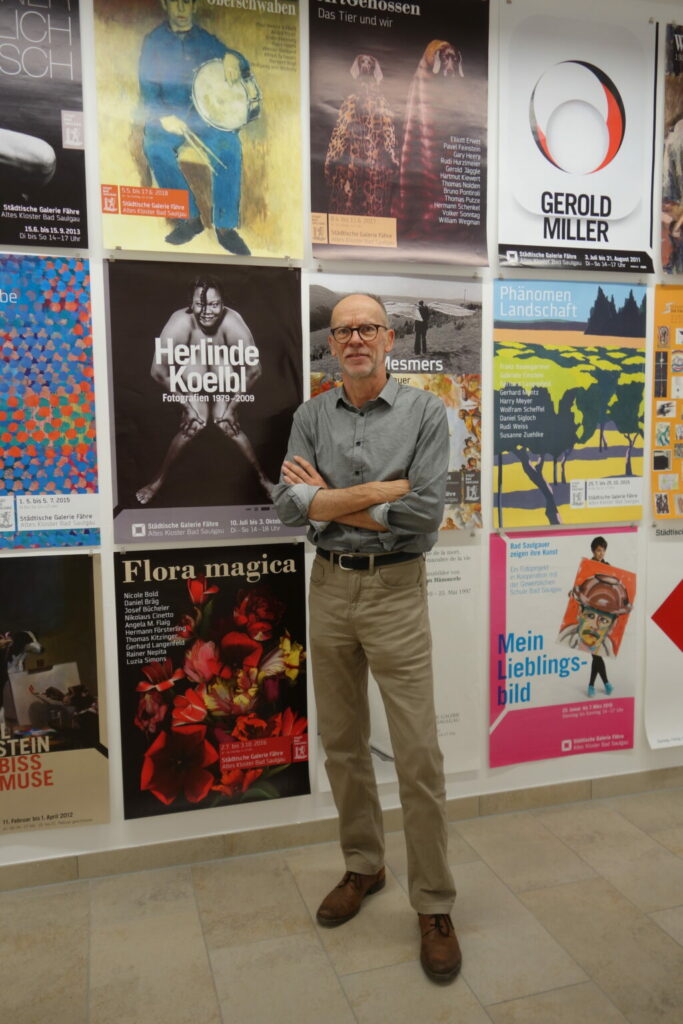Rückblick in Postern: Andreas Ruess vor einer Wand mit Plakaten, die an die Ausstellungen in der Fähre erinnern.  Ruess ist mit der Künstlerin Ingrid Butschek verheiratet und wohnt in Bad Saulgau. Foto: Multer