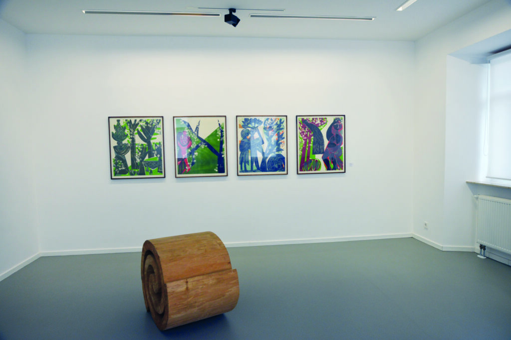 Wachter-Grieshaber: Holz und die Kunst des Holzschnitts und der entsprechenden Drucke war immer wieder Thema in der Fähre im Rahmen der „Holzwege“-Ausstellungen. Im Hintergrund die Drucke von HAP Grieshaber, im Vordergrund “New Grange VI“ von Rudolf Wachter, das 1991 entstand. Foto: Rudi Multer