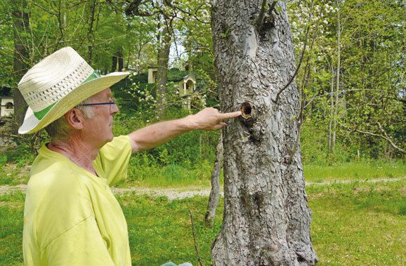 „Unser Auftrag heute ist vor allem, den Astbestand an der Straße zu beschneiden“, informiert Wilfried Wydler, mit der Astsäge hoch überm Kopf arbeitend Margit Speidel. Wydler ist schon seit Jahren ein vom Landesverband für Obstbau, Garten und Landschaft Baden-Württemberg e.V. (LOGL) geprüfter Fachwart für Obst und Garten sowie geprüfter Obstbaumpfleger. Frau Speidel hat erst kürzlich die Ausbildung beendet und möchte ihre Praxis-Erfahrung erweitern. Auf einer Wiese unterhalb des Ummendorfer Kreuzbergs stehen viele alte Apfelbäume, deren Alter Wydler auf dreißig bis siebzig Jahre beziffert. Vorbildlich ließ deren Besitzer auch Totholz-Stämme stehen, in denen sich Insekten tummeln. Sie legen darin auch ihre Eier ab. Die sich entwickelnden Maden sind ideales Futter für Jungvögel, die viel Eiweiß brauchen. „Baumstümpfe sind Biodiversität vom Feinsten“, erklärt der Baumwart und klappt ein Stück Rinde auf, hinter der Ameisen schmalen Terrassen gebaut haben. Auf der Wiese, auf der Wydler und Speidel mit langer Astsäge und Schneidgiraffe „die Wüchsigkeit“ der Apfelbäume eindämmen, herrscht Anfang Mai ein ständiges Summen. Ein rosa-weißer Traum hingetupft von üppigen Blüten.