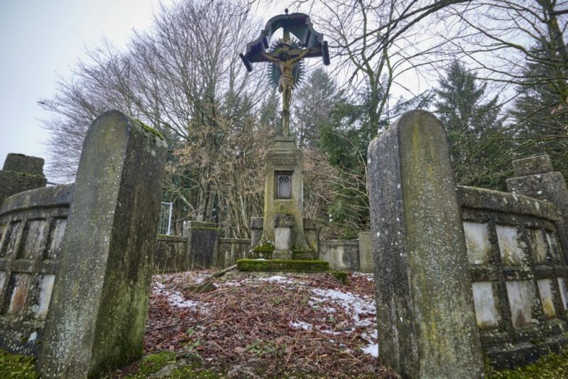 Es ist ein Arma-Christi-Kreuz am Rand eines steil abfallenden Tobels, fast fünf Meter hoch, inmitten eines gemauerten Rondells, das zusammen zu brechen droht. Der Corpus Christi ist noch stabil, aber das Dach hält nicht mehr lange, die Folterwerkzeuge seiner Peiniger sind brüchig, der Überlieferung nach hat er durch seine Auferstehung an Ostern über sie gesiegt und seinen Gläubigen Erlösung und Trost gebracht.